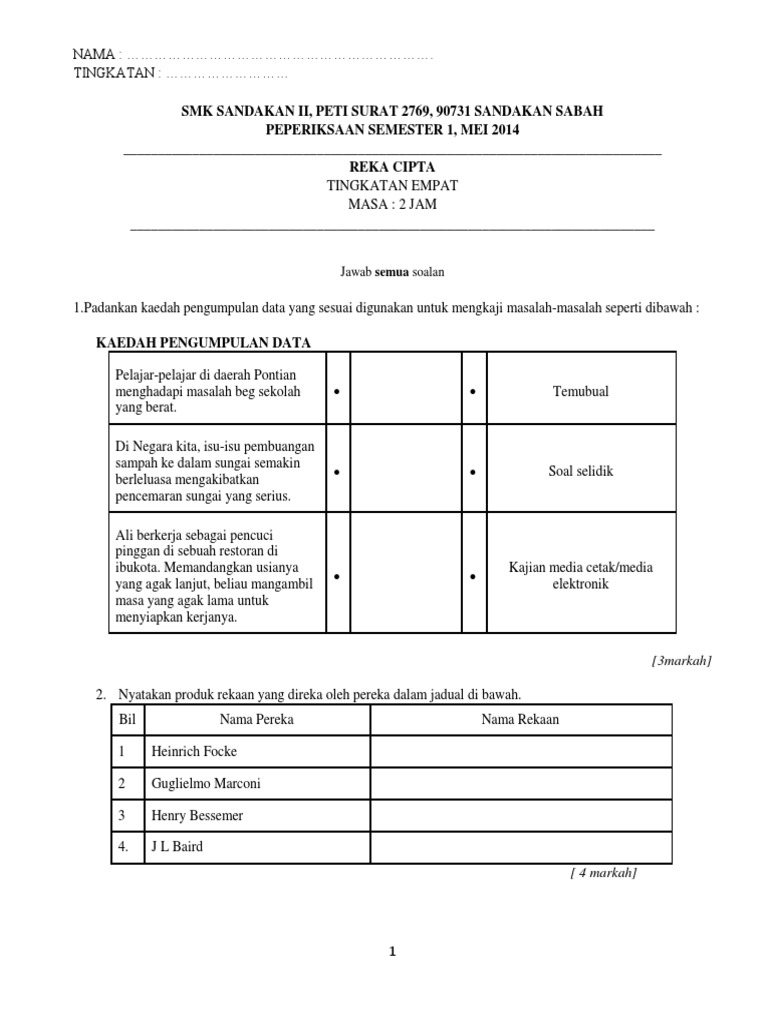 Contoh Kertas Soalan Reka Cipta Tingkatan 4